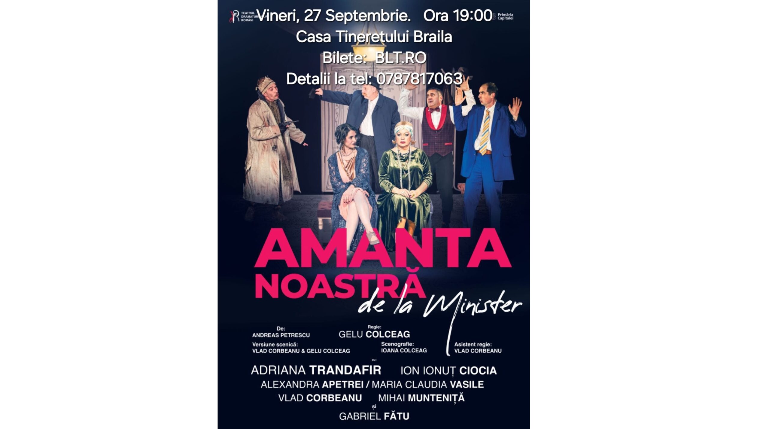 Vineri, 27 septembrie, de la ora 19.00, sunteți invitați la o comedie sclipitoare, ”Amanta noastră de la Minister”, de Andreas Petrescu, în regia lui Gelu Colceag.