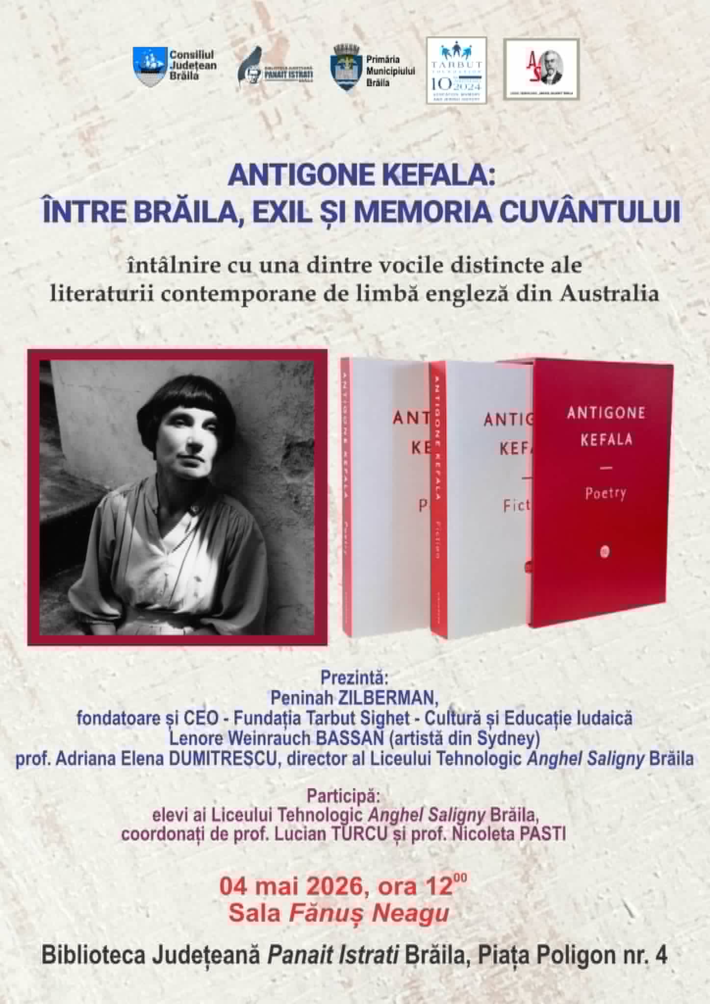 Biblioteca Județeană Panait Istrati Brăila vă invită luni, 4 mai 2026, începând cu ora 12.00, la sala Fănuș Neagu, et. 3, la evenimentul cultural Antigone Kefala – Între Brăila, exil și memoria cuvântului, dedicat uneia dintre cele mai importante voci ale literaturii australiene contemporane.