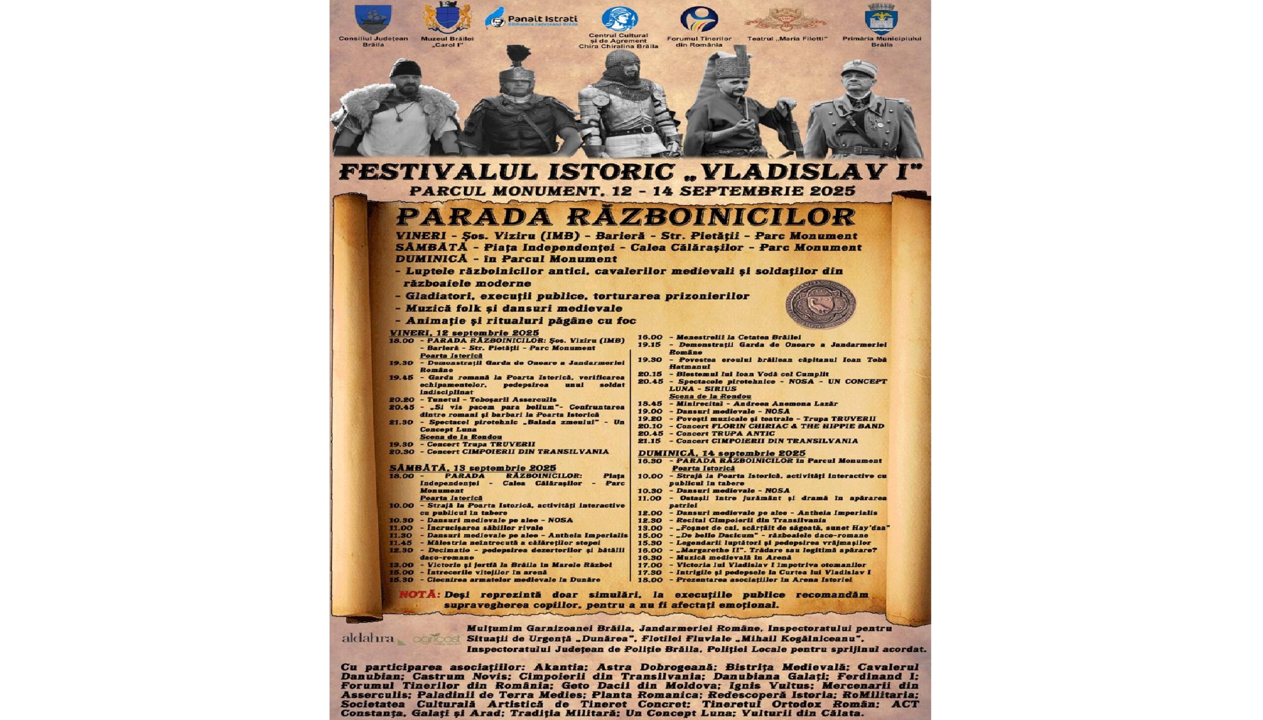 În perioada 12-14 septembrie, Festivalul Istoric ‘Vladislav I’, ajuns la a 5-a ediție, eveniment care se va desfășura în Parcul Monument din municipiul Brăila, va include parade, reconstituiri și spectacole menite să aducă la viață epoci istorice diferite, de la războaiele antice până la luptele moderne.