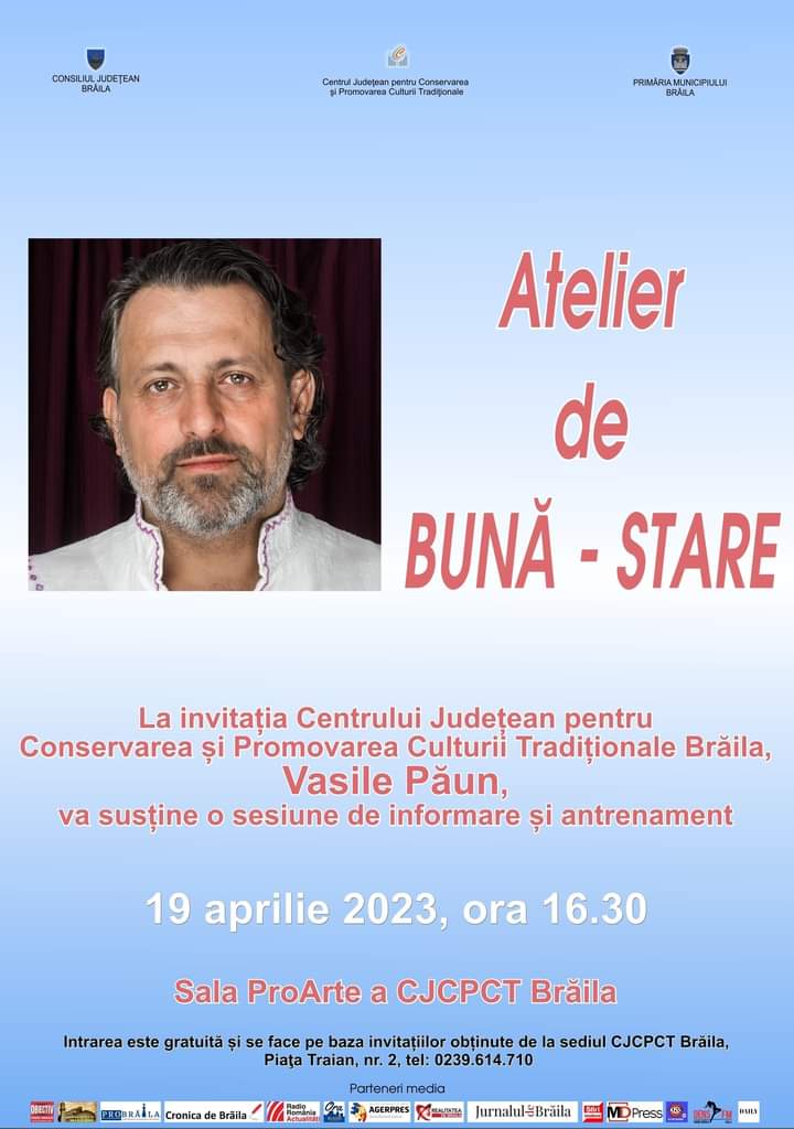 Centrul Judeţean pentru Conservarea şi Promovarea Culturii Tradiţionale Brăila organizează în data de 19 aprilie 2023, ora 16.30,  în incinta Sălii ProArte, Atelierul de Bună-Stare, avându-l ca invitat special pe domnul Vasile Păun, orator inspiraţional, mentor în leadership intuitiv şi antreprenor social.