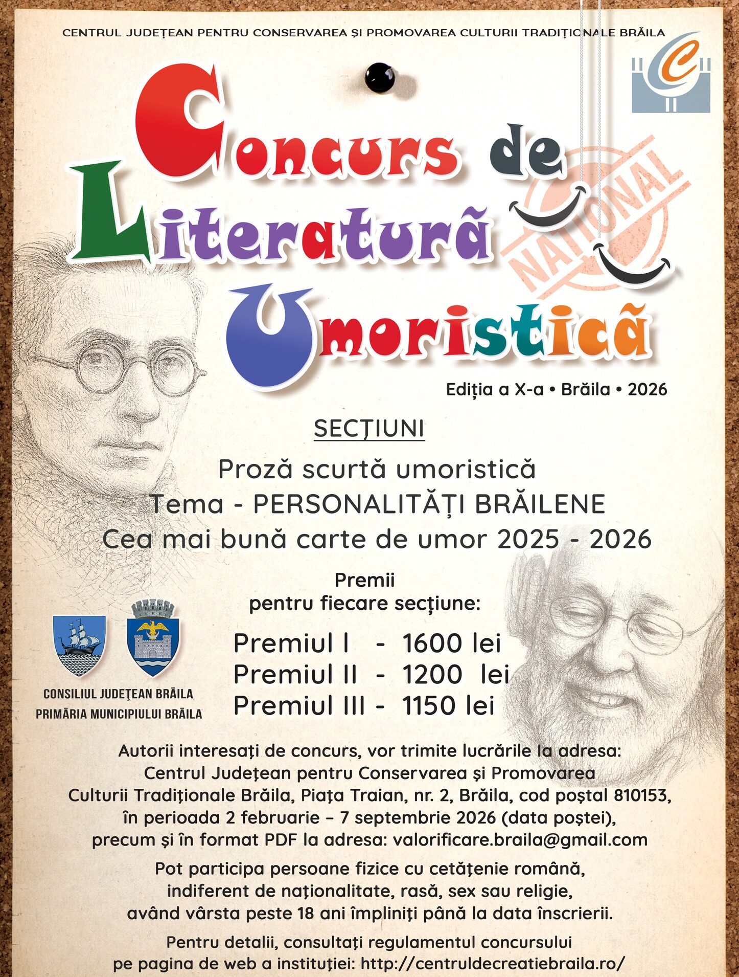 Centrul Judeţean pentru Conservarea şi Promovarea Culturii Tradiţionale Brăila, organizează în perioada februarie-noiembrie 2026, a X-a ediţie a Concursului naţional de literatură umoristică.