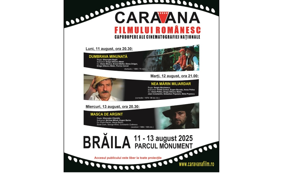 Caravana filmului românesc – Capodopere ale cinematografiei naționale revine la Brăila, în Parcul Monument, în perioada 11 – 13 august 2025, cu proiecții de film românesc la sărbătoarea Zilelor Municipiului Brăila. Brăilenii și turiștii sunt așteptați să participe la proiecții de film în aer liber în cadrul ”Caravanei filmului românesc”.