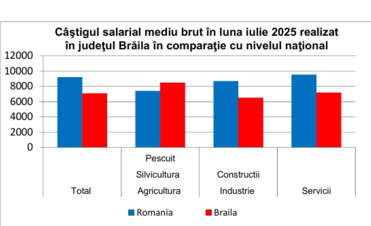 Comparativ cu luna iulie a anului precedent, Direcția Regională de Statistică Brăila precizează faptul că în ultimele 12 luni câștigul salarial mediu nominal net în județul Brăila a crescut cu 5,8%, 4327 de lei în luna iulie 2025, față de 4088 de lei în luna iulie 2024.