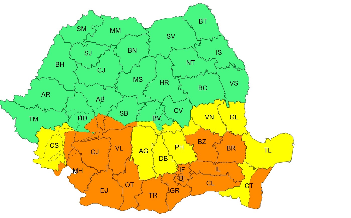 În perioada 2 octombrie, ora 20:00 – 3 octombrie, ora 10:00, o avertizare Cod portocaliu de intensificări puternice ale vântului va afecta județele Teleorman, Giurgiu, Călărași, Ialomița, Brăila, Buzău, Ilfov, zona de litoral a județului Constanța și Municipiul București. În aceste areale, vântul va avea intensificări susținute, cu rafale de 70 – 85 km/h.