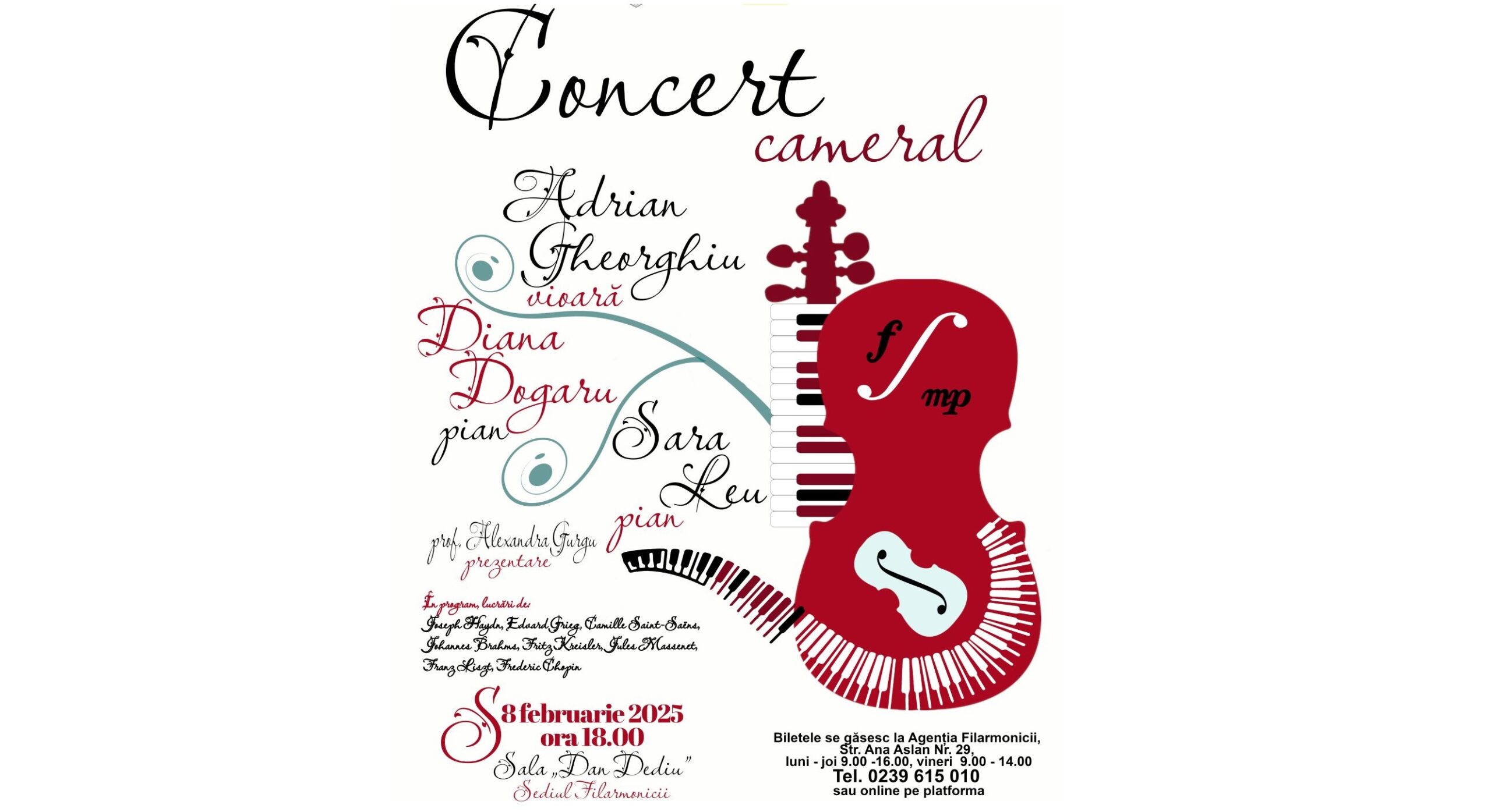 O sâmbătă seară, de început de februarie, sonoritățile pline de finețe ale viorii și pianului, atmosfera intimă și elegantă a sălii „Dan Dediu”. Acestea sunt premisele concertului cameral din data de 8 februarie 2025, ora 18.00, de la sediul Filarmonicii Lyra-George Cavadia, în care vă veți putea bucura de un mănunchi de lucrări de o sensibilitate aparte.