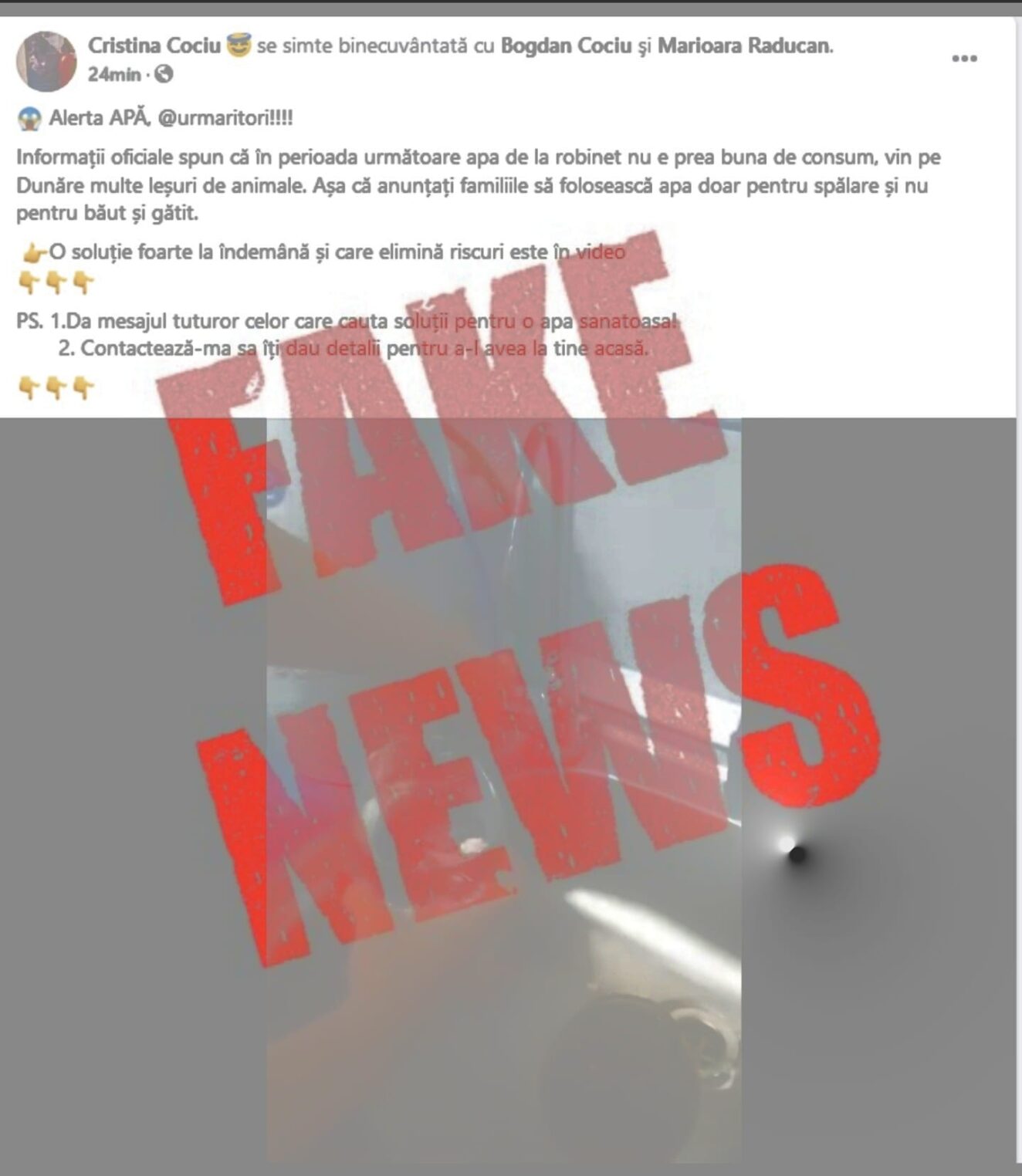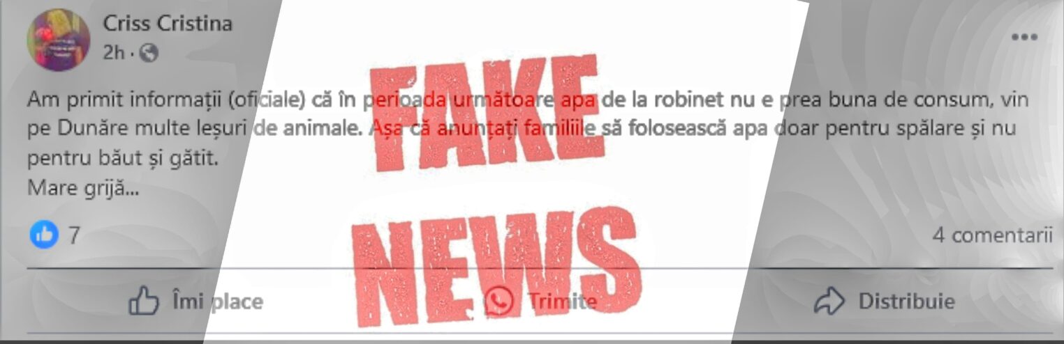 În mediul on line a fost distribuit un mesaj prin care populația era alarmată de posibilitatea ca apa de la robinete să fie infestată. „Am primit informații (oficiale) că în perioada următoare apa de la robinet nu e prea bună de consum, vin pe Dunăre multe leșuri de animale. Așa că anunțați familiile să folosească apa doar pentru spălare și nu pentru băut și gătit.”, se scria în acele mesaje.