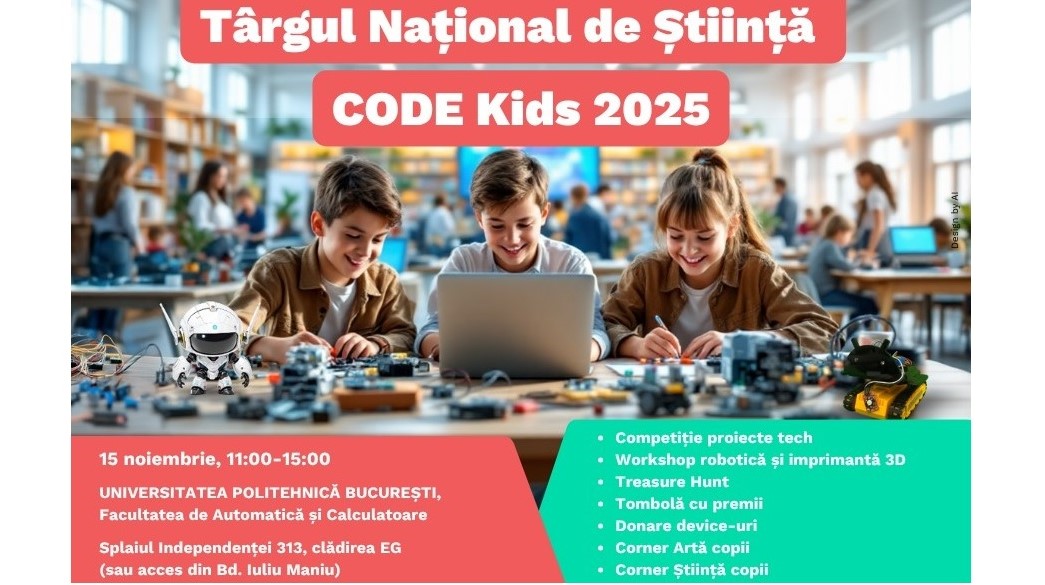 Sâmbătă, 15 noiembrie 2025, între orele 11:00 și 15:00, are loc Târgul Național de Știință CODE Kids 2025 la Facultatea de Automatică și Calculatoare din cadrul Universității Naționale de Știință și Tehnologie Politehnica București, organizat de Fundația Progress. Câte 2 copii cu vârste între 10 și 15 ani, reprezentanți ai celor 20 de echipe CODE Kids din țară și din Republica Moldova care s-au calificat la Târgurile-Hackathon Regionale de Știință CODE Kids 2025 din județele Tulcea, Sălaj, Prahova, Vâlcea, Iași, Argeș, Brăila și Neamț desfășurate în perioada 3 septembrie – 10 octombrie 2025, vin la București să-și prezinte proiectele de robotică lucrate în cadrul bibliotecilor publice pentru rezolvarea problemelor comunitare și să se întreacă într-o competiție palpitantă a celor mai frumoase proiecte tech.