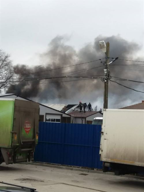 Update: În urma incendiului produs într-o hală a unui service auto au ars circa 300 metri pătrați de acoperiș și 20 de anvelope. Au mai ars cantități de ulei de motor, vopsea, scule și utilaje pentru reparații auto, un motor auto, aparatură electronică și calculatoare, centrala termică, dar și 8 autoturisme aflate în service, 7 dintre ele aflate în hală și una în afara atelierului. Incendiul s-a extins și la un atelier de electronică industrială unde au ars circa 130 metri pătrați de acoperiș, 3 laptop-uri, 5 imprimante, aparatură electrocasnică, documente, scule și aparatură electronică.
