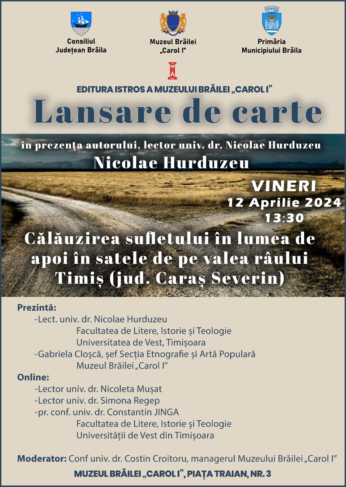 Muzeul Brăilei „Carol I” vă invită vineri, 12 aprilie 2024, ora 13:30 la lansarea cărții Călăuzirea sufletului în lumea de apoi în satele de pe valea râului Timiș (jud. Caraș Severin), în prezența autorului, lector univ. dr. Nicolae Hurduzeu, volum apărut la Editura Istros a Muzeului Brăilei „Carol I” anul acesta. Evenimentul are loc la sediul Muzeului Brăilei „Carol I” din Piața Traian, nr. 3, sala „Regele Ferdinand și Regina Maria”.