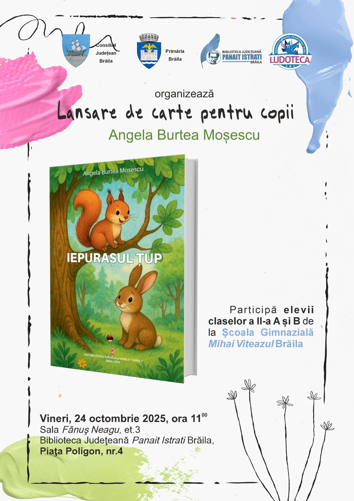 Biblioteca Județeană Panait Istrati Brăila invită publicul la lansarea celei mai recente cărți semnate de autoarea și cadrul didactic Angela Burtea Moșescu – Iepurașul Țup. Evenimentul va avea loc vineri, 24 octombrie 2025, de la ora 11:00, în sala Fănuș Neagu a bibliotecii, situată în Piața Poligon nr. 4, Brăila.