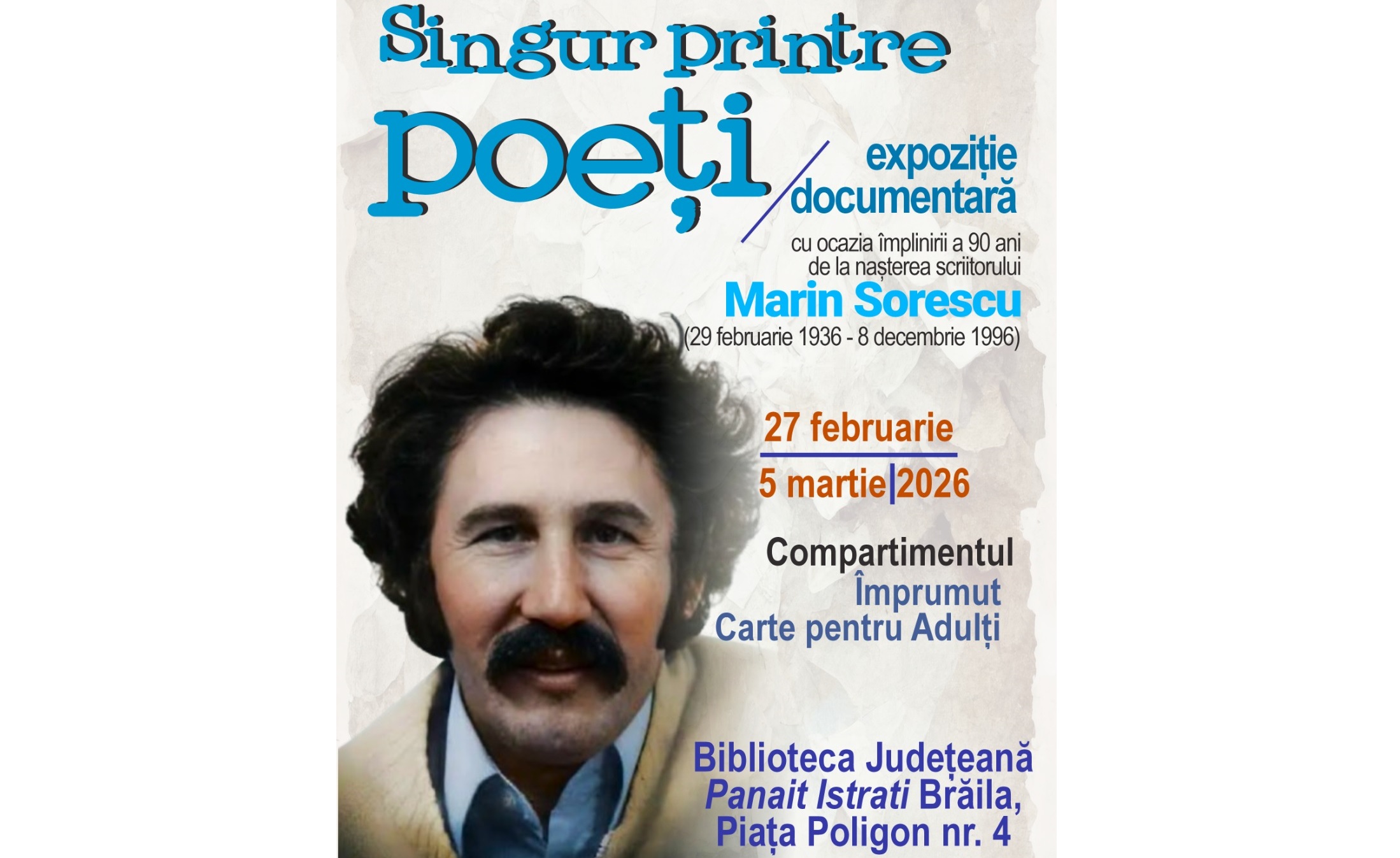 Pentru a marca împlinirea a 90 de ani de la nașterea scriitorului, la Compartimentul Împrumut Carte pentru Adulți se organizează expoziția documentară Singur printre poeți, deschisă publicului în perioada 27 februarie – 5 martie 2026. Expoziția de carte este realizată de Silvia Iacob, bibliotecar.