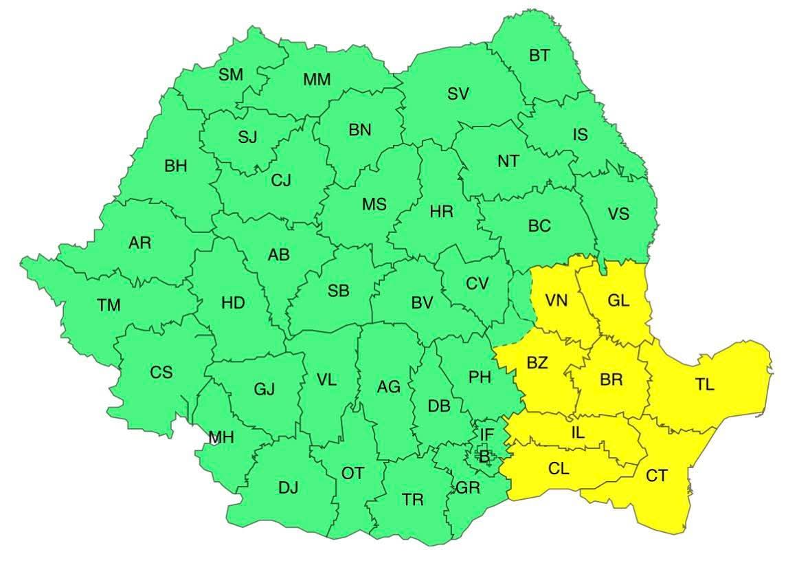 Administrația Națională de Meteorologie (ANM) a emis o atenționare Cod galben de intensificări ale vântului pentru opt județe, valabilă de joi, ora 22:00, până sâmbătă, la ora 20:00. Județele vizate de atenționare sunt: Vrancea, Galați, Buzău, Brăila, Ialomița, Călărași, Tulcea și Constanța.