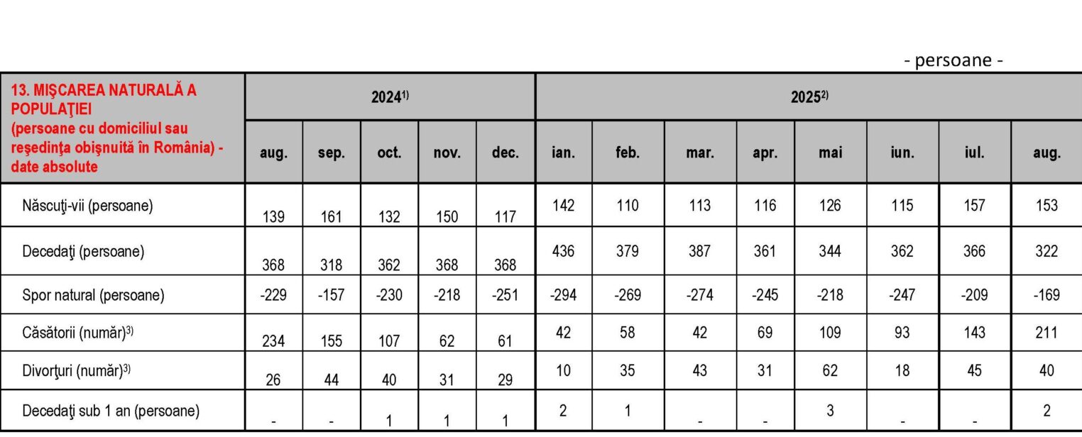 Sporul natural negativ a scăzut de la – 209 persoane în luna iulie 2025 la – 169 persoane în luna august 2025. Sporul natural reprezintă diferența dintre numărul născuților-vii și numărul persoanelor decedate, în perioada de referință.