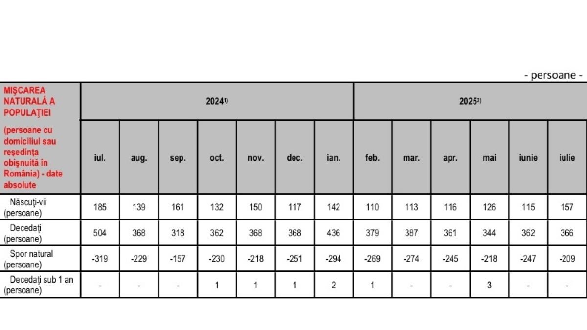 Sporul natural negativ a scăzut de la 247 de persoane în luna iunie 2025 la 209 persoane în luna iulie 2025.