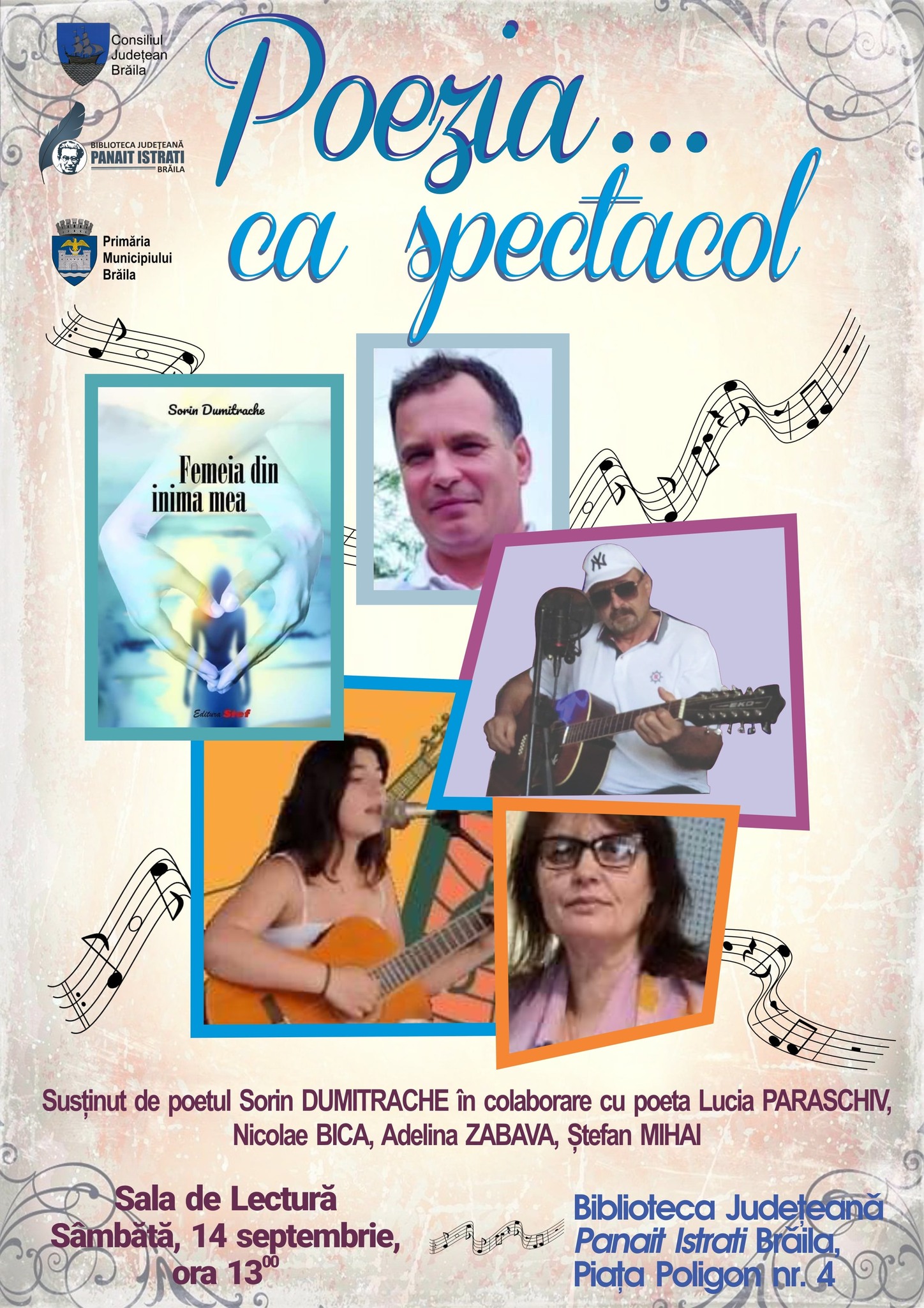 Brăilenii sunt invitați sâmbătă, 14 septembrie, începând cu ora 13.00, la Biblioteca Județeană ”Panait Istrati” Brăila, la „POEZIA…CA SPECTACOL”, un eveniment cu muzică folk și poezie de bună calitate susținut de Sorin Dumitrache și Lucia Paraschiv.