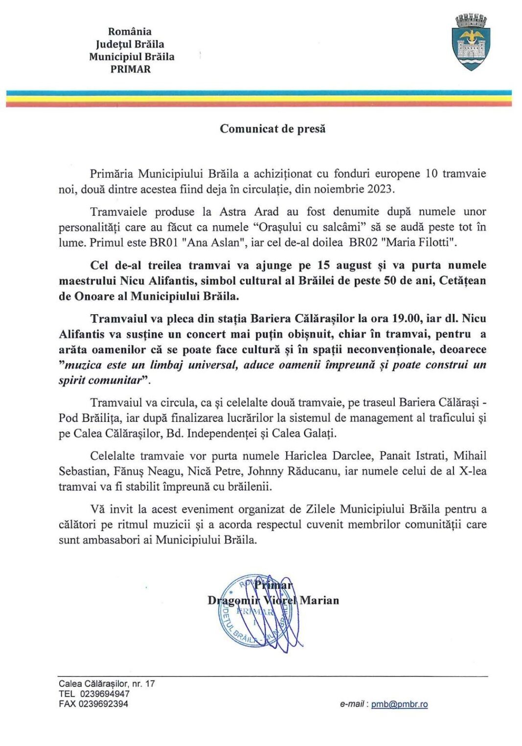 ”Tramvaiul cu numărul BR 03 ”Nicu Alifantis” va pleca din staţia Bariera Călăraşilor, la ora 19.00, iar Nicu Alifantis va susţine un concert mai puţin obişnuit, chiar în tramvaiul care-i poartă numele, pentru a arăta oamenilor că se poate face cultură şi în spaţii neconvenţionale, deoarece muzica este un limbaj universal, aduce oamenii împreună şi poate construi un spirit comunitar”, conform comunicatului de presă transmis de Primăria Brăila.