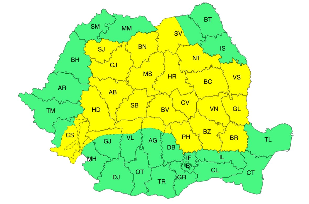 În intervalul 27 august, ora 10 – 28 august, ora 03, în Transilvania, la munte, în cea mai mare parte a Moldovei și nordul Munteniei vor fi perioade cu instabilitate atmosferică. Aceasta se va manifesta prin averse torențiale, descărcări electrice și intensificări ale vântului (rafale în general de 50…60 km/h). Pe alocuri vor fi vijelii și grindină. Cantitățile de apă vor fi de 15…25 l/mp și izolat de peste 30…40 l/mp.
