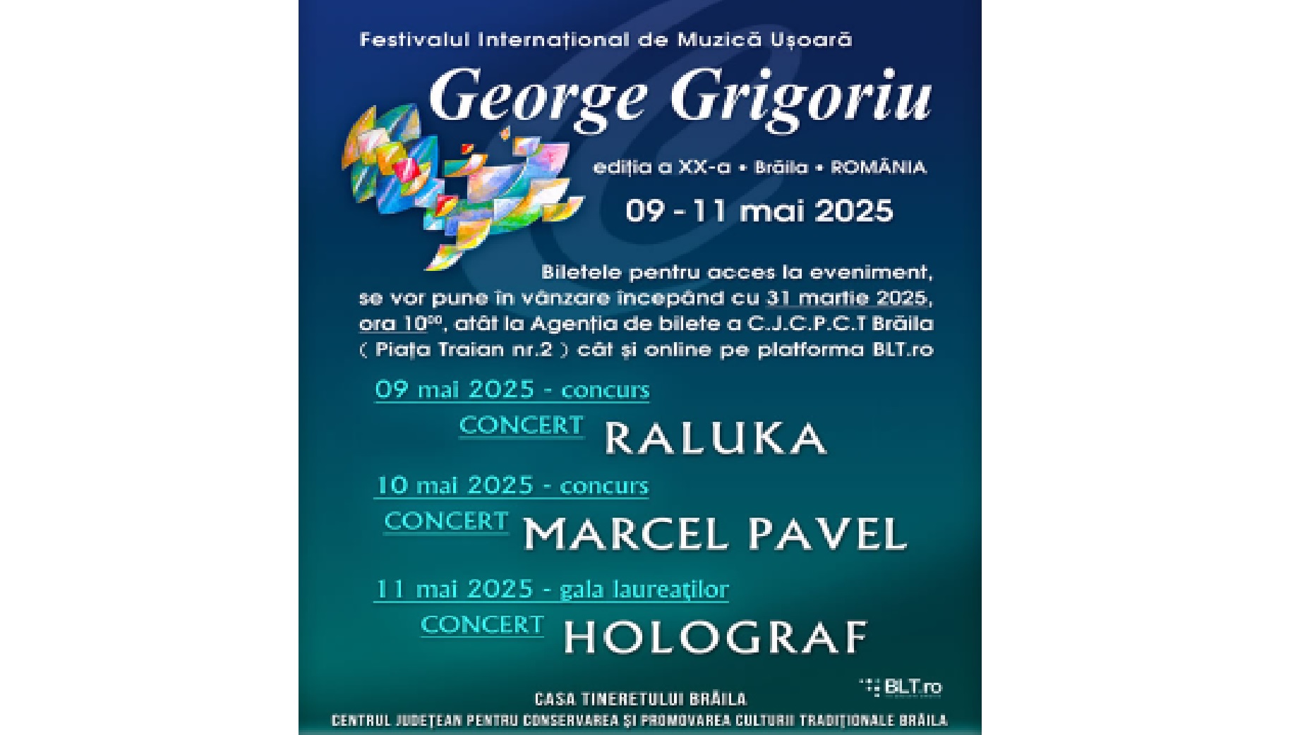 În perioada 9-11 mai are loc Festivalul Internațional de Muzică Ușoară George Grigoriu ediția a XX-a. La ediția din acest an vor participa 20 de concurenți, dintre care 10 din România și 10 din străinătate. Dintre concurenții din străinătate, 6 sunt din Italia, și câte unul din Ucraina, Cehia, Bulgaria și Malta.