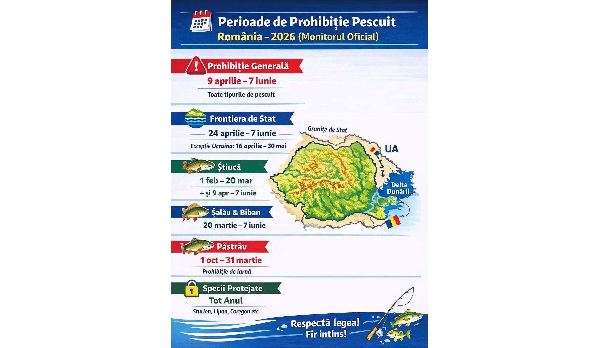 În perioada 9 aprilie – 7 iunie 2026 este interzis pescuitul comercial, recreativ și familial al tuturor speciilor de pești, crustacee, moluște și alte viețuitoare acvatice vii, în toate habitatele piscicole naturale: Dunăre, râuri, pâraie, lacuri și Delta Dunării. Măsurile de prohibiție au ca scop protejarea resurselor acvatice vii în perioada de reproducere și asigurarea refacerii naturale a populațiilor piscicole.