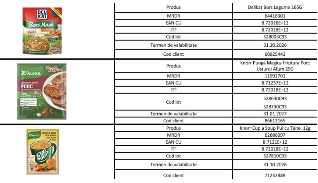 Produsele retrase sunt Delikat Borș Legume de 165 grame (EAN 8720182944849, lot 528003C93), Knorr Cup a Soup Pui cu Tăiței de 12 grame (EAN 8712100867507, lot 527810C93) și Knorr Punga Magică Friptură Porc Usturoi Afumat de 29 grame (cod de bare 8712566109739, loturi 528630C93 și 528730C93). Restul produselor mărcile Delikat și Knorr sunt sigure pentru consum.