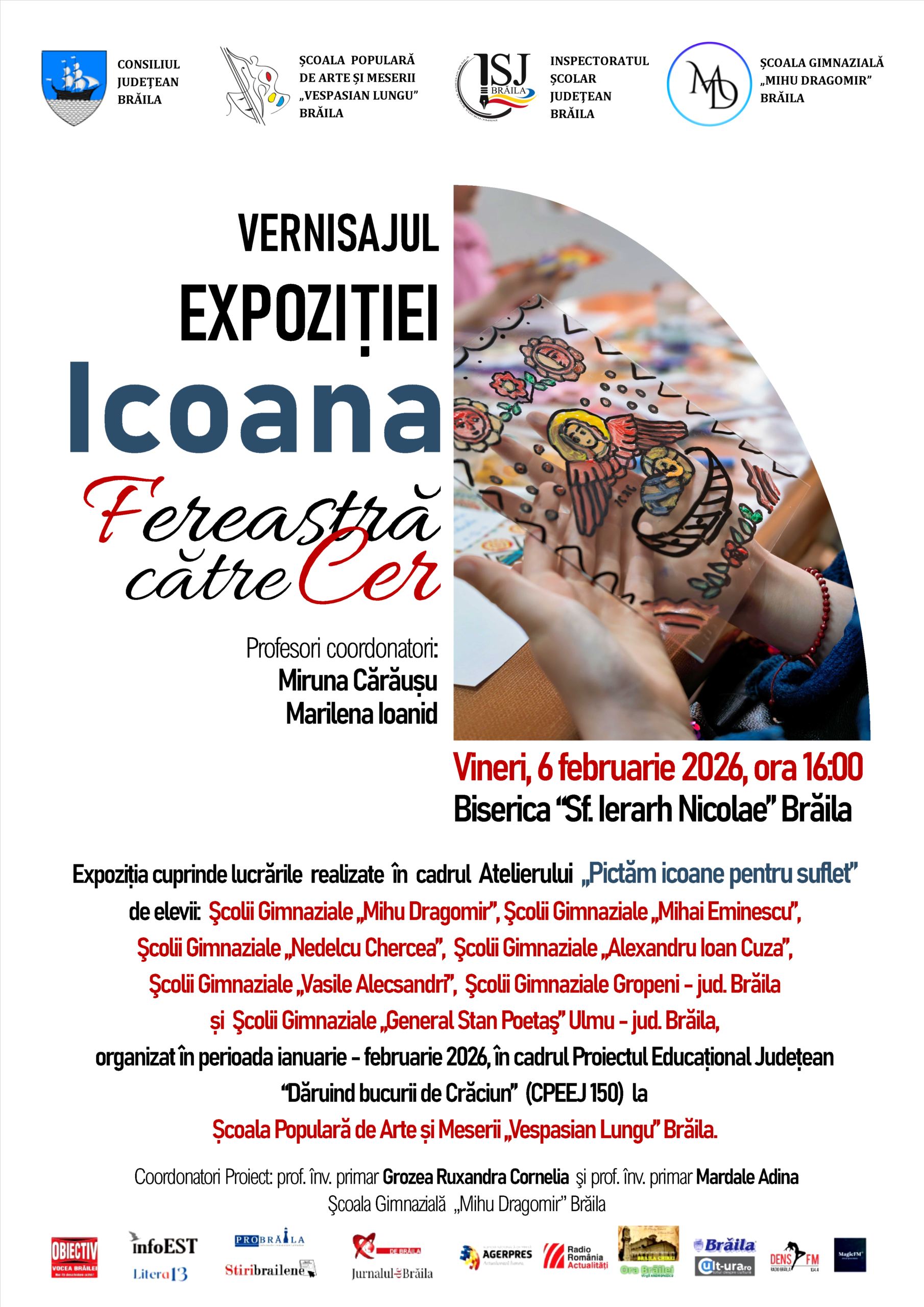 Proiectul se va încheia în data de 6 februarie 2026, ora 16.00 cu Expoziția „Icoana – fereastră către Cer”, care va reuni toate lucrările realizate de elevi pe parcursul atelierelor și va fi găzduită de Biserica „Sfântul Ierarh Nicolae” Brăila, Preot Paroh Iordache Iulian, oferind publicului larg ocazia de a admira talentul, răbdarea și sensibilitatea artistică a tinerilor participanți.