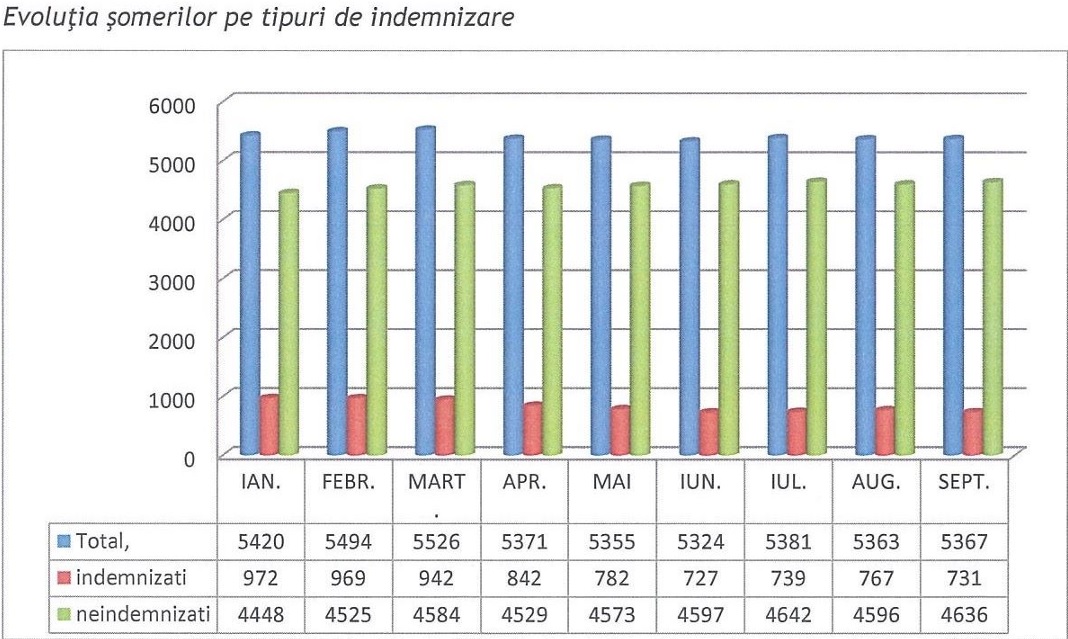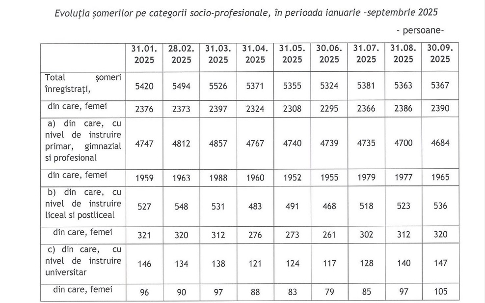 În ceea ce privește evoluția șomerilor pe categorii socio-profesionale, ponderea cea mai mare a fost reprezentată de persoanele cu nivel de instruire primar, gimnazial și profesional, în procent de 88,0 % medie/lună. Ponderea șomerilor cu nivel de instruire liceal și postliceal a fost reprezentată în procent de 9,5 % medie/lună; iar ponderea șomerilor cu nivel de instruire universitar a fost de 2,5 % medie/lună. Ponderea femeilor cu nivel de instruire primar, gimnazial și profesional a fost de 83,4 % medie/lună, mai scăzută cu 8,2 puncte procentuale decât a bărbaților (91,6 % medie/lună).