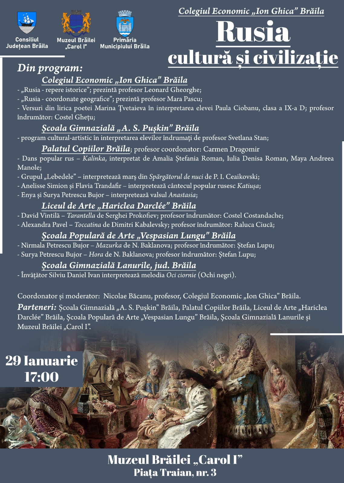 Muzeul Brăilei „Carol I” găzduiește luni, 29 ianuarie 2024, ora 17:00, în sala „Regele Ferdinand și Regina Maria” (Piaţa Traian nr. 3), un spectacol de muzică și poezie cu tema „Rusia – cultură și civilizație”, organizat de Colegiul Economic „Ion Ghica” Brăila în colaborare cu Școala Gimnazială „A. S. Pușkin” Brăila, Palatul Copiilor Brăila, Liceul de Arte „Hariclea Darclée” Brăila, Școala Populară de Arte „Vespasian Lungu” Brăila, Școala Gimnazială Lanurile și Muzeul Brăilei „Carol I”.