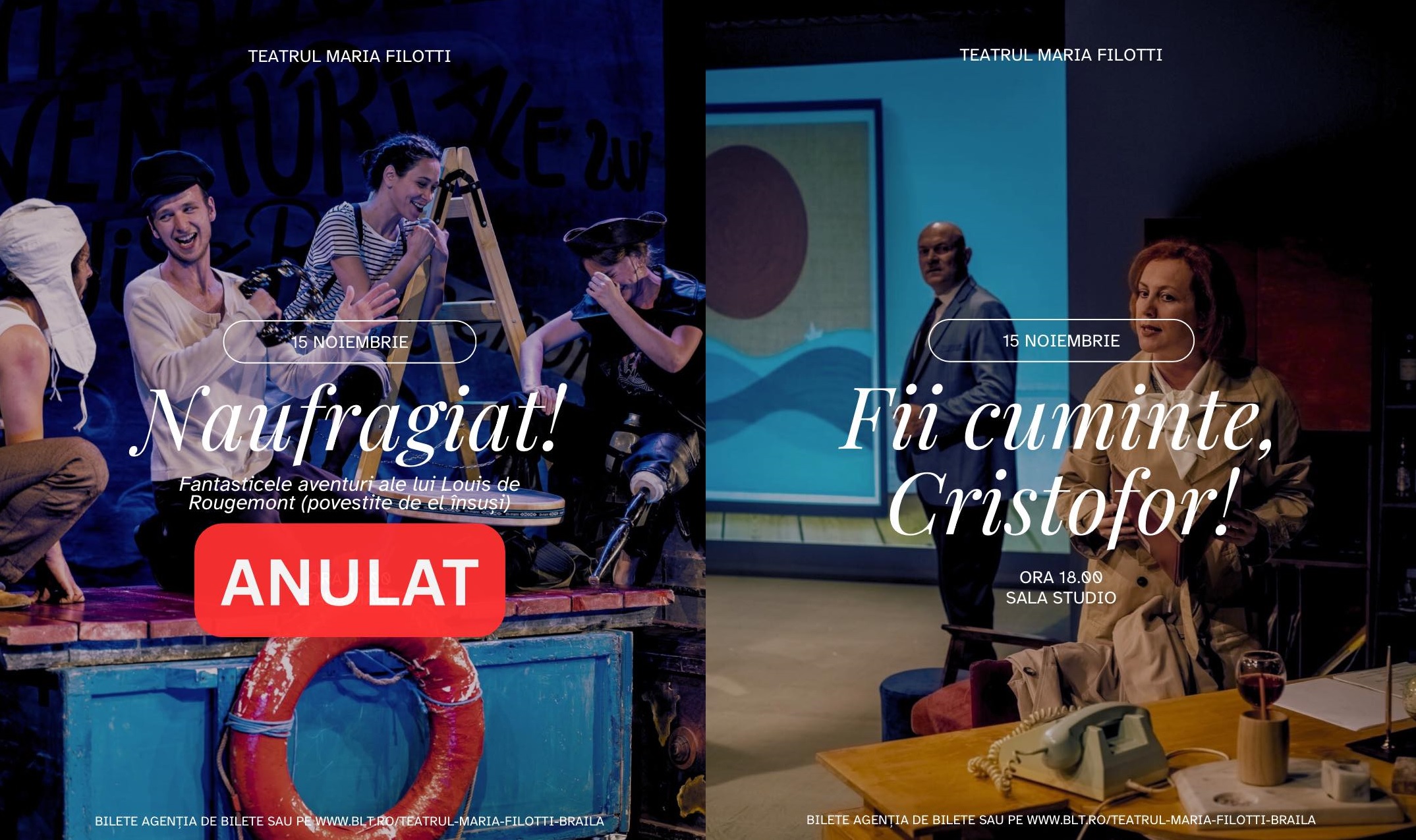 Teatrul Maria Filotti anunță că spectacolul ”Naufragiat!”, programat pentru data de 15 noiembrie, în Sala Mare, a fost anulat. În această situație, sâmbătă, 15 noiembrie, se va juca piesa ”Fii cuminte, Cristofor!”, de Aurel Baranga, regia Marcel Turcoianu.