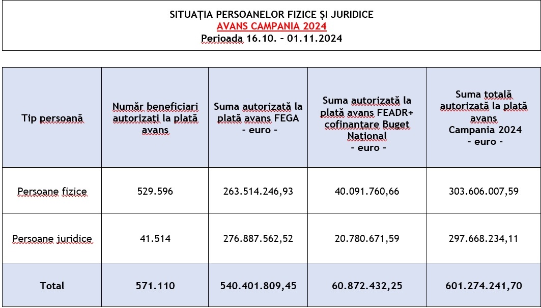 Agenția de Plăți și Intervenție pentru Agricultură (APIA) informează că în perioada 16.10. – 01.11.2024, a autorizat la plată în cadrul Campaniei de plăți în avans, aferentă anului de cerere 2024, un număr de 571.110 fermieri, cu o sumă totală de 601.274.241,70 euro (2.991.537.895,42 lei).