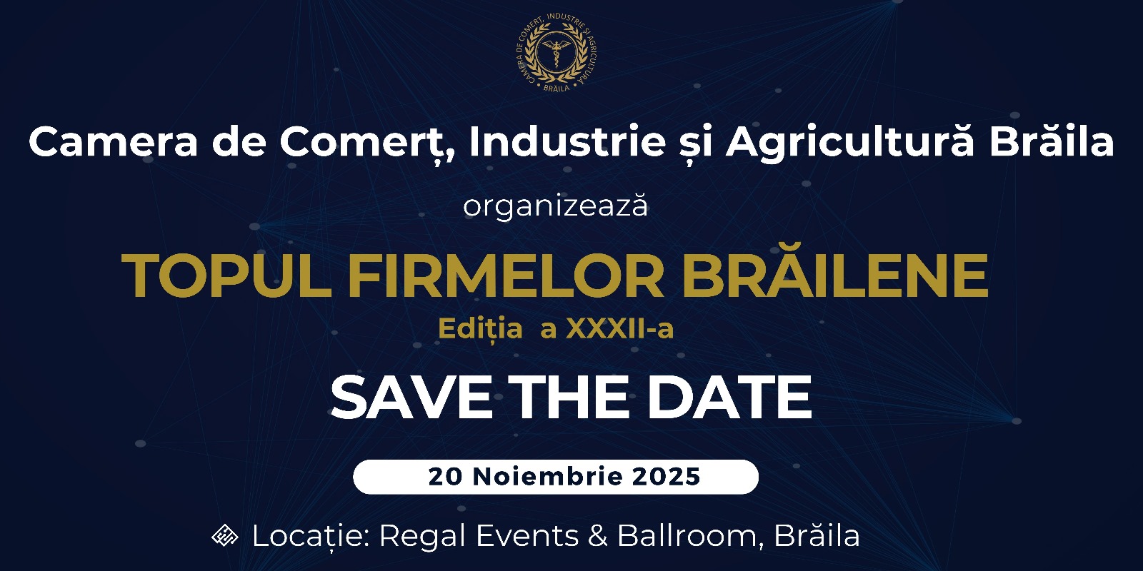 Camera de Comerț, Industrie și Agricultură Brăila invită mediul de afaceri local să participe la „Topul Firmelor Brăilene 2025”, evenimentul de gală dedicat performanței economice și spiritului antreprenorial din județ, care va avea loc joi, 20 noiembrie, de la ora 19:00, la Restaurant Regal Events & Ballroom din Brăila.