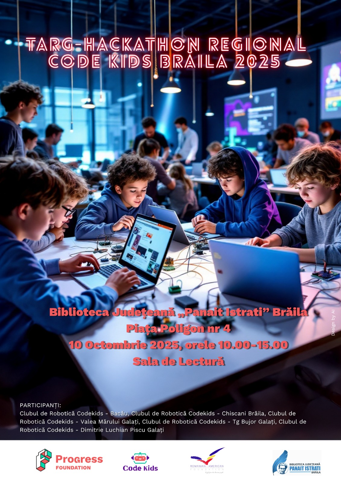 Biblioteca Județeană Panait Istrati Brăila organizează vineri, 10 octombrie 2025, între orele 10:00 – 15:00, Târgul – Hackathon Regional Code Kids Brăila 2025.