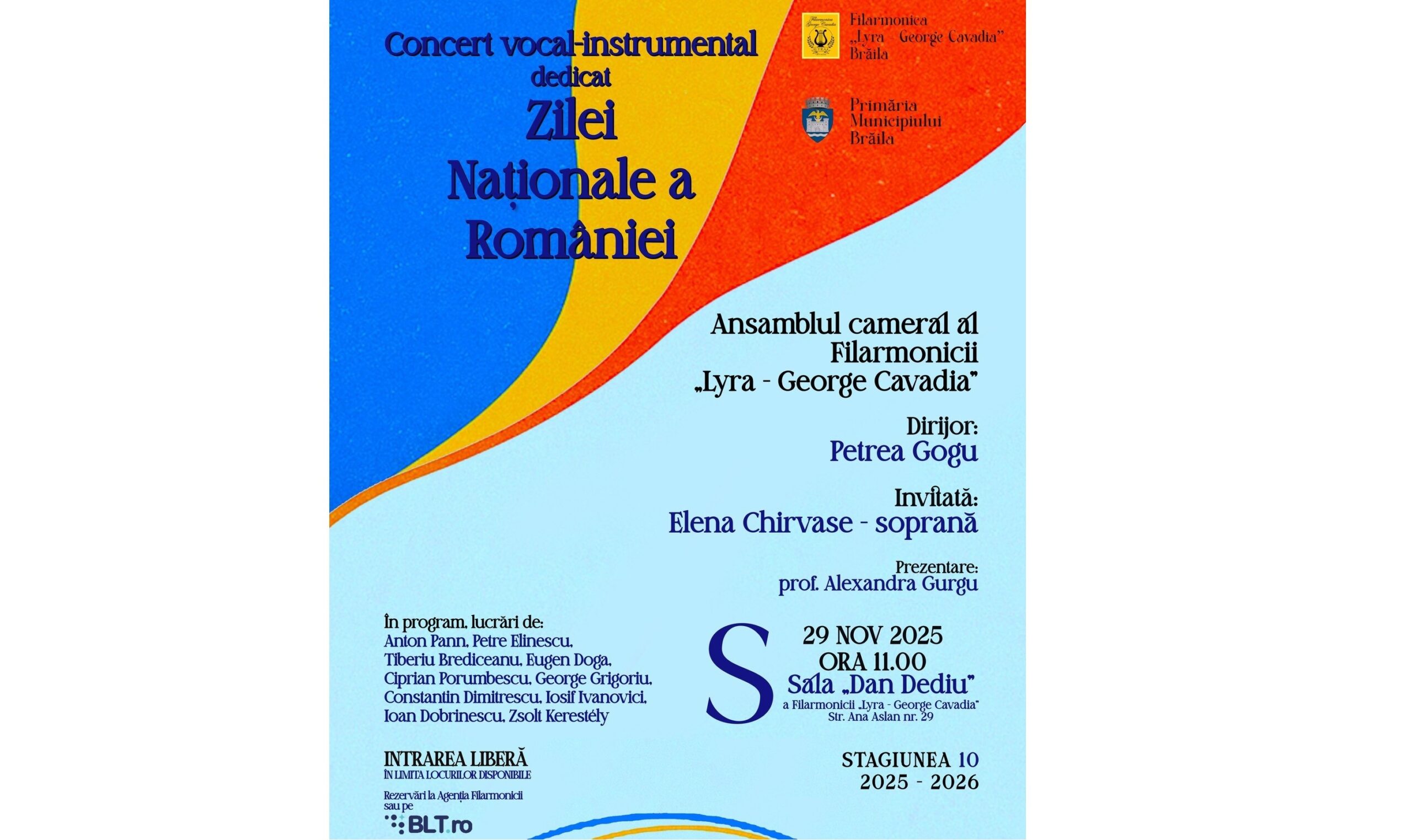 Sâmbătă, 29 noiembrie 2025, de la ora 11:00, Sala „Dan Dediu” va găzdui o întâlnire cu muzica românească în forma ei cea mai autentică. Ansamblul cameral al Filarmonicii, condus de dirijorul Petrea Gogu, va contura un traseu sonor care unește folclorul rafinat cu pagini orchestrale devenite simboluri ale patrimoniului nostru. Soprana Elena Chirvase va aduce strălucire vocală acestui moment festiv, însuflețind lucrări ce vorbesc despre dor, frumusețe și demnitate. Atmosfera va fi îmbogățită și de prezența a doi soliști ai Filarmonicii: Gheorghe Constantinescu, clarinetist și Radu Banariuc, violonist, ale căror fraze vibrante vor aduce un plus de finețe și intensitate momentelor muzicale.